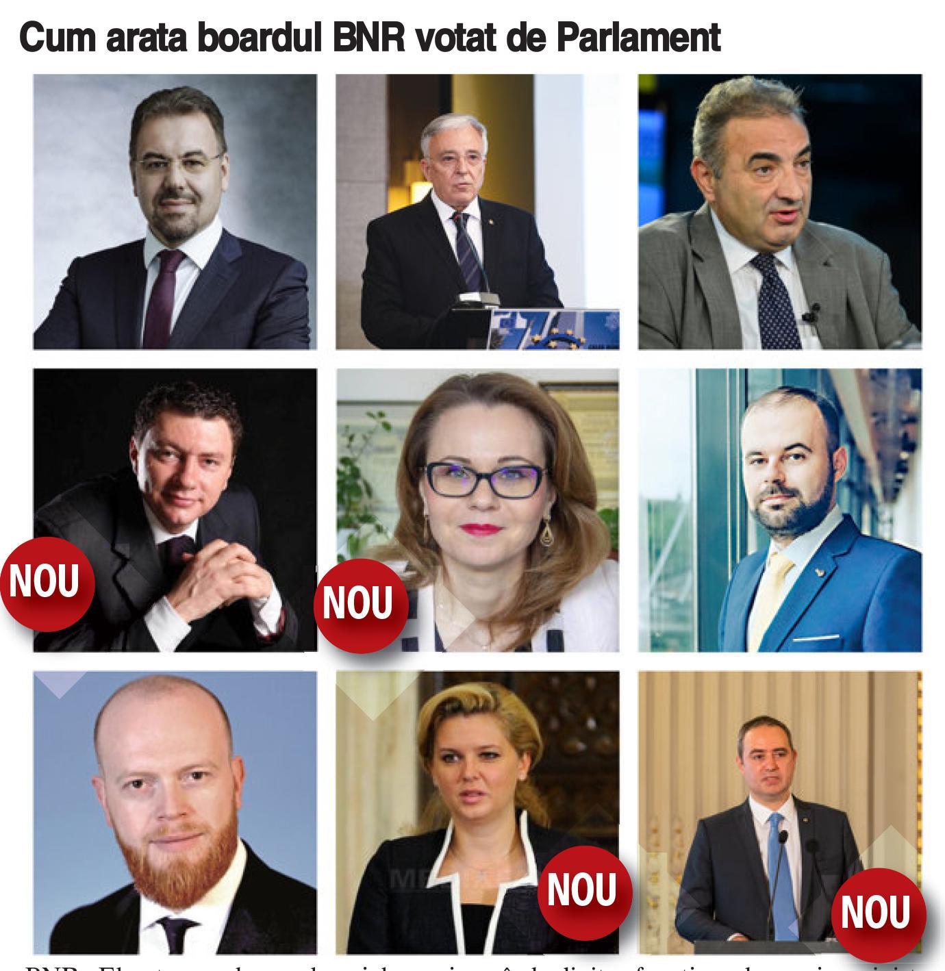 Isărescu, guvernator BNR: Asistăm la o tranziţie a conducerii politicii monetare din România spre generaţii mai tinere ♦ Cosmin Marinescu (viceguvernator), Aura Gabriela Socol (membru), Roberta Anastase (membru) şi Alexandru Nazare (membru) sunt nou intraţi în CA-ul BNR ♦ Eugen Nicolăescu, Gheorghe Gherghina, Dan Radu Ruşanu şi Virgil Stoenescu au ieşit din board BNR.