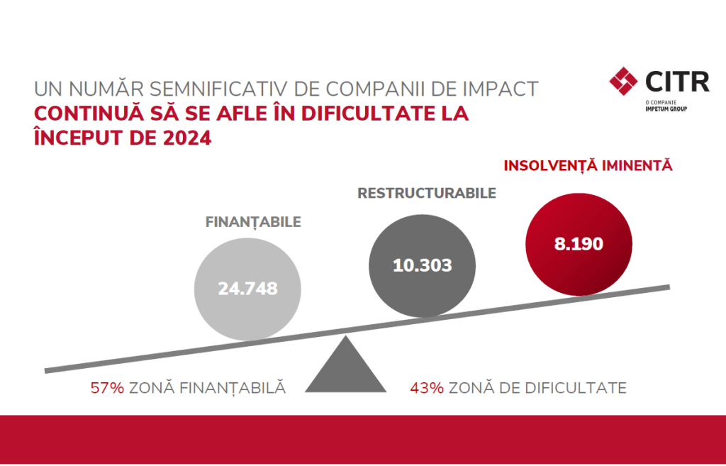 CITR, liderul pieței de insolvență și restructurare din România, anunță că numărul companiilor de impact aflate în insolvență iminentă crește cu 18%, de la 6.949 la 8.190, iar cel al companiilor de impact aflate în dificultate atinge cel mai înalt nivel din 2013 până în prezent. Studiul a fost realizat pe baza celor mai actuale date financiare oficiale, raportat la situația financiară a companiilor la începutul anului 2024, potrivit unui comunicat.