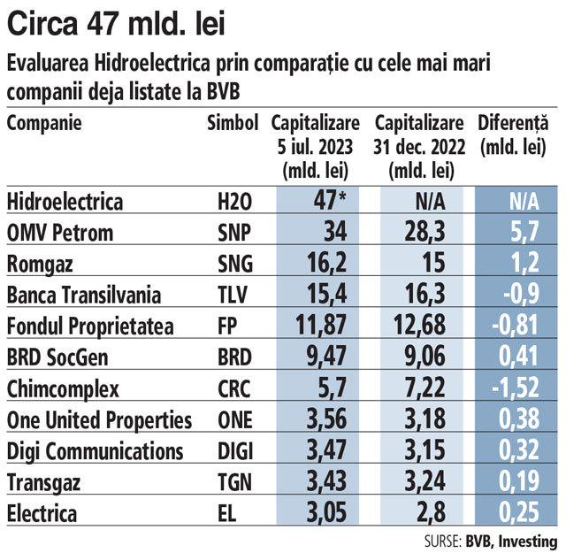 Pusă în context, capitalizarea este aproape cât valoarea de piaţă cumulată a OMV Petrom (SNP), unicul producător local de petrol şi gaze, actualmente cea mai mare companie de la BVB, şi grupul financiar Banca Transilvania (TLV), cea mai mare instituţie de credit din România în funcţie de active. Cele două societăţi sunt evaluate la 34 mi­li­arde, respectiv 15,4 miliarde de lei.