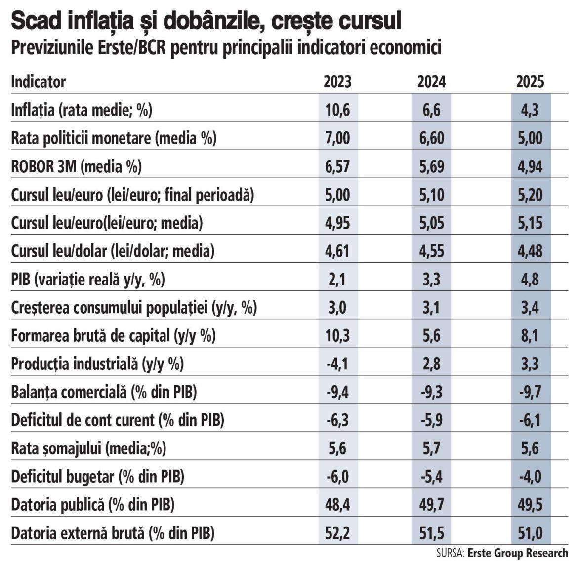 Cursul valutar va depăşi 5 lei/euro, dobânda-cheie scade la 5,75% până la final de 2024, de la 7% în prezent, şi inflaţia va coborî spre 5%. Media ROBOR 3M scade sub 5,7% în 2024
