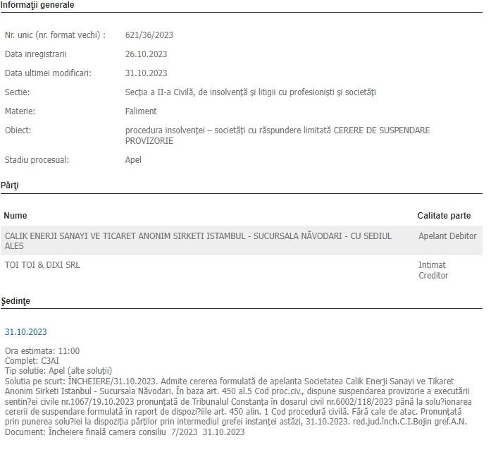 Curtea de Apel Constanța a suspendat sentința civilă a Tribunalului Constanța prin intermediul căreia s-a decis intrarea în insolvență a companiei Calik Enerji Sanayi Ve Ticaret Anonim Sirketi Istanbul – Sucursala Năvodari, firmă specializată în lucrări de construcții a proiectelor utilitare pentru electricitate și telecomunicații.