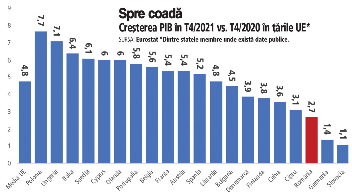 Duş rece pentru economie de la Statistică: economia a frânat mult peste aşteptările pieţei în T4/2021 şi trage în spate şi creşterea economică din 2022. economie Economia României a înregistrat a treia cea mai slabă evoluţie din Uniunea Europeană în T4/2021