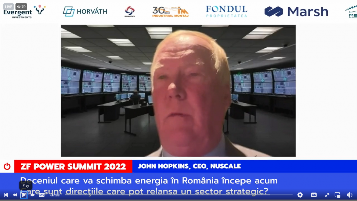 John Hopkins, CEO NuScale, compania care va produce reactoarele nucleare mici (SMR) pentru România, a spus, la ZF Power Summit, că planul companiei este de a producea reactoarele într-o fabrică, iar una dintre fabrici ar putea fi în România.