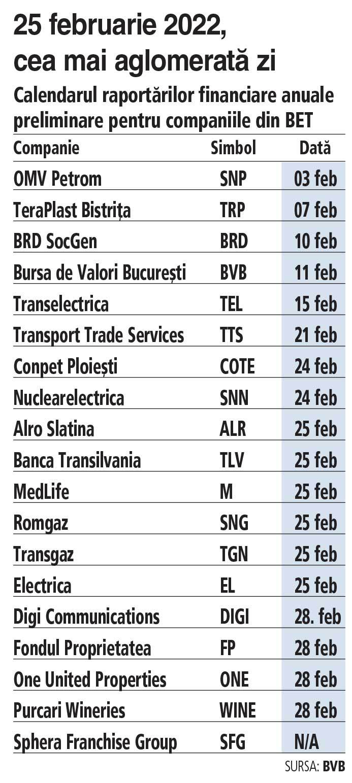 OMV Petrom (SNP), cea mai mare companie listată la bursa de la Bucureşti, deschide sezonul raportărilor anuale joi, 3 februarie, odată cu publicarea raportului financiar preliminar aferent anului 2021 şi cu teleconferinţa pentru prezentarea rezultatelor, potrivit datelor agregate de ZF de la BVB.Read More