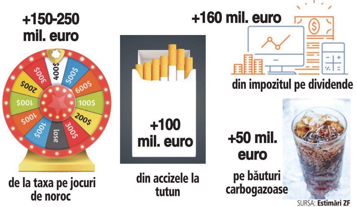 Statul ar urma să încaseze în jur de 500 de milioane de euro în plus la bugetul de stat în 2022 în urma majorării accizei la tutun, a TVA pentru sucuri carbogazoase şi a creşterii impozitului pe dividende şi pe câştiguri din jocuri de noroc, arată calculele ZF, pe baza datelor obţinute din piaţă. Pe bugetul de stat actual, deficitul bugetar ar scădea de la 15,5 mld. euro (5,8% din PIB) la 15 mld. euro, adică 5,6% din PIB.
