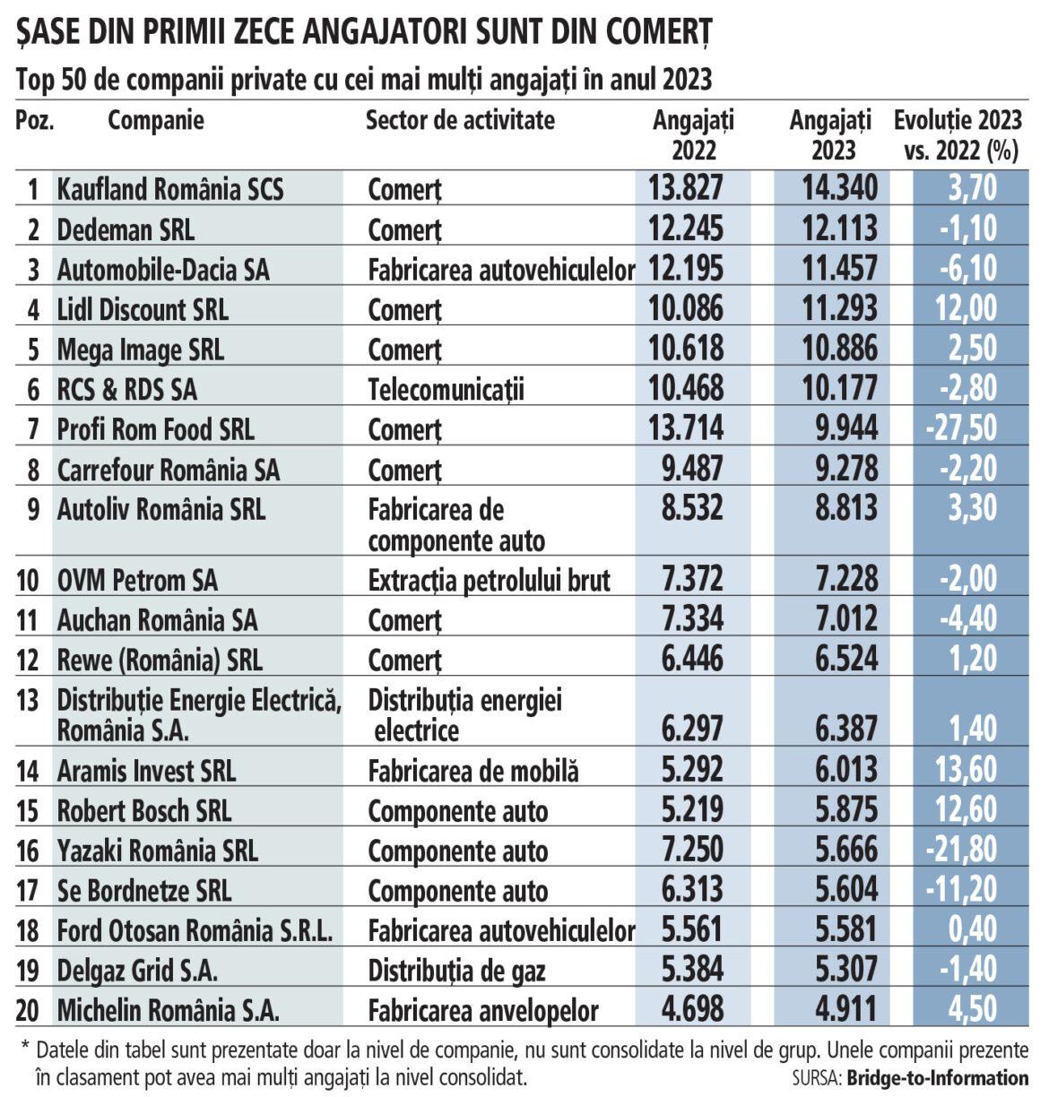 Datele analizate în clasament sunt doar la nivel de companii, nu de grupuri. Aşadar, numărul de angajaţi prezentat în top nu reprezintă numărul consolidat pentru toate companiile din grup. De exemplu, Carrefour, Dacia, Continental şi Leoni au la nivel consolidat un număr mult mai mare de angajaţi.