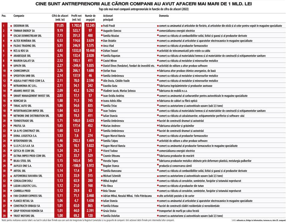 Aproape 40 de companii şi câteva grupuri de firme cu acţionariat românesc au reuşit în 2022 să intre sau să se menţină în clasamentul afacerilor antreprenoriale care au depăşit o cifră de afaceri de 1 miliard de lei. Acesta este cel mai bun an ca rezultate pentru aceste businessuri antreprenoriale româneşti, iar lista „miliardarilor“ în lei se îmbogăţeşte an de an cu un nou membru sau chiar mai mulţi. Dacă ne uităm la 2017, doar 12 firme româneşti atingeau acest nivel, astfel că ultimii ani, deşi marcaţi de o pandemie, apoi război care a condus la inflaţie galopantă şi creşteri de preţuri pe linie, au adus tot mai multe companii importante pe harta businessului românesc.
